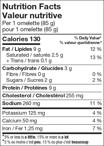 Cooking Instructions for 1 x 85 g omelette: Heat to an internal temperature of 60°C-70°C. Time and temperatures may vary by appliance.