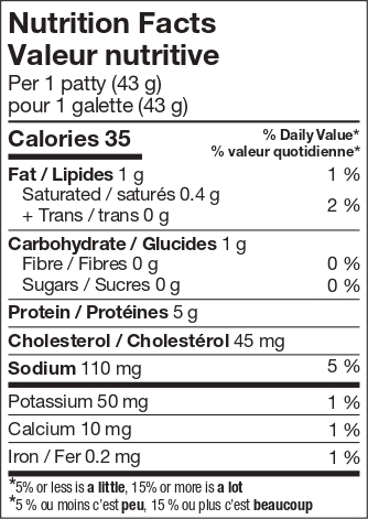 Heating Instructions for 1 x 43 g patty: Heat to an internal temperature of 60°C-70°C. Time and temperatures may vary by appliance.