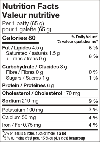 Heating Instructions for 1 x 65 g patty: Heat to a minimum internal temperature of 60°C – 70°C.