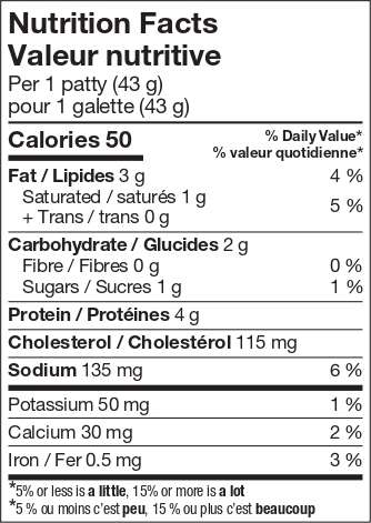 Heating Instructions for 1 x 43 g patty: Heat to an internal temperature of 60°C-70°C. Time and temperatures may vary by appliance.